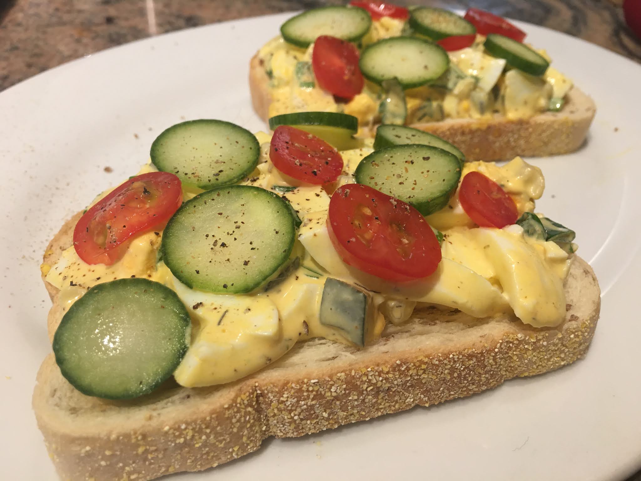 Full egg breakfast with sausage, pan-fried grape tomatoes, rye toast, cucumber, and mandarin.
